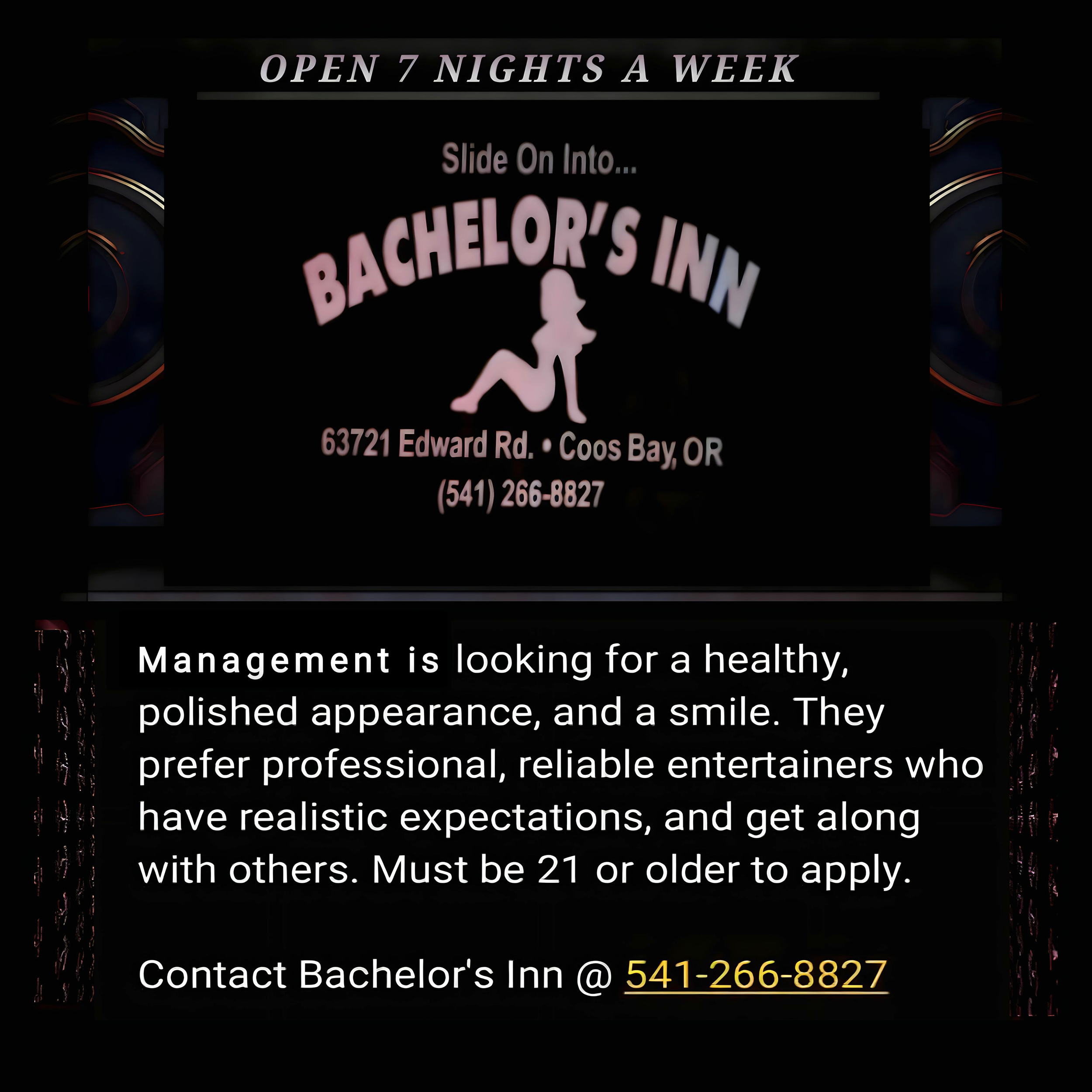 We are proud to be the premier adult entertainment nightclub along the Oregon Coast. Open 7 nights a week, we have a vast line up of the most beautiful, fully nude, female dancers that the Pacific Northwest has to offer. So whether you are having a drink from the bar, playing one of our Oregon state lottery games, or better yet, enjoying a private dance in our VIP area, we invite you to ‘slide on into Bachelor’s Inn’. You’ll be glad you did.